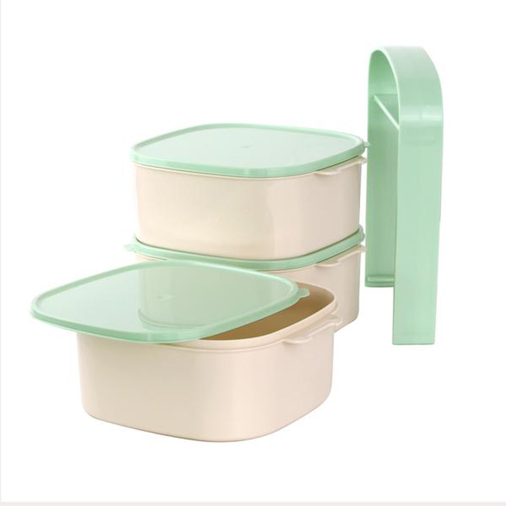 Praktický pomocník na uchovávání a přenášení horkých i studených pokrmů. Třípatrový jídlonosič je vyroben z kvalitního plastu. Objem jedné nádoby je 1,2 l, různobarevná víčka.