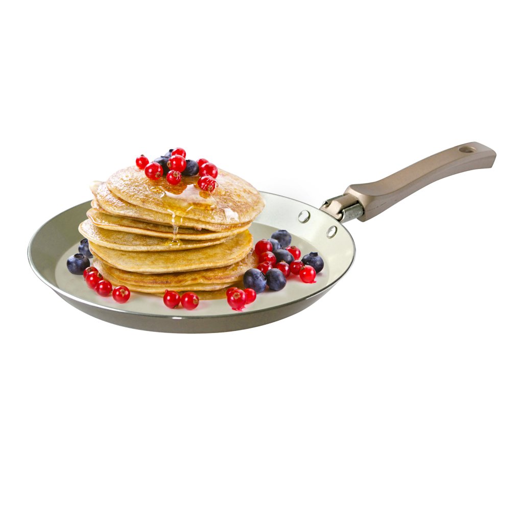 Nízká keramická pánev na palačinky, vajíčka aj. s nepřilnavým keramickým povrchem.Pánev je určena na všechny druhy spotřebičů kromě indukce.Zdravá kuchyně bez použití tuku a s malými nároky na údržbu. Moderní barevné provedení - champagne. Zabroušené dno rozvádí teplotu rovnoměrně po celé nádobě. Vhodná do myčky. Průměr 22 cm.